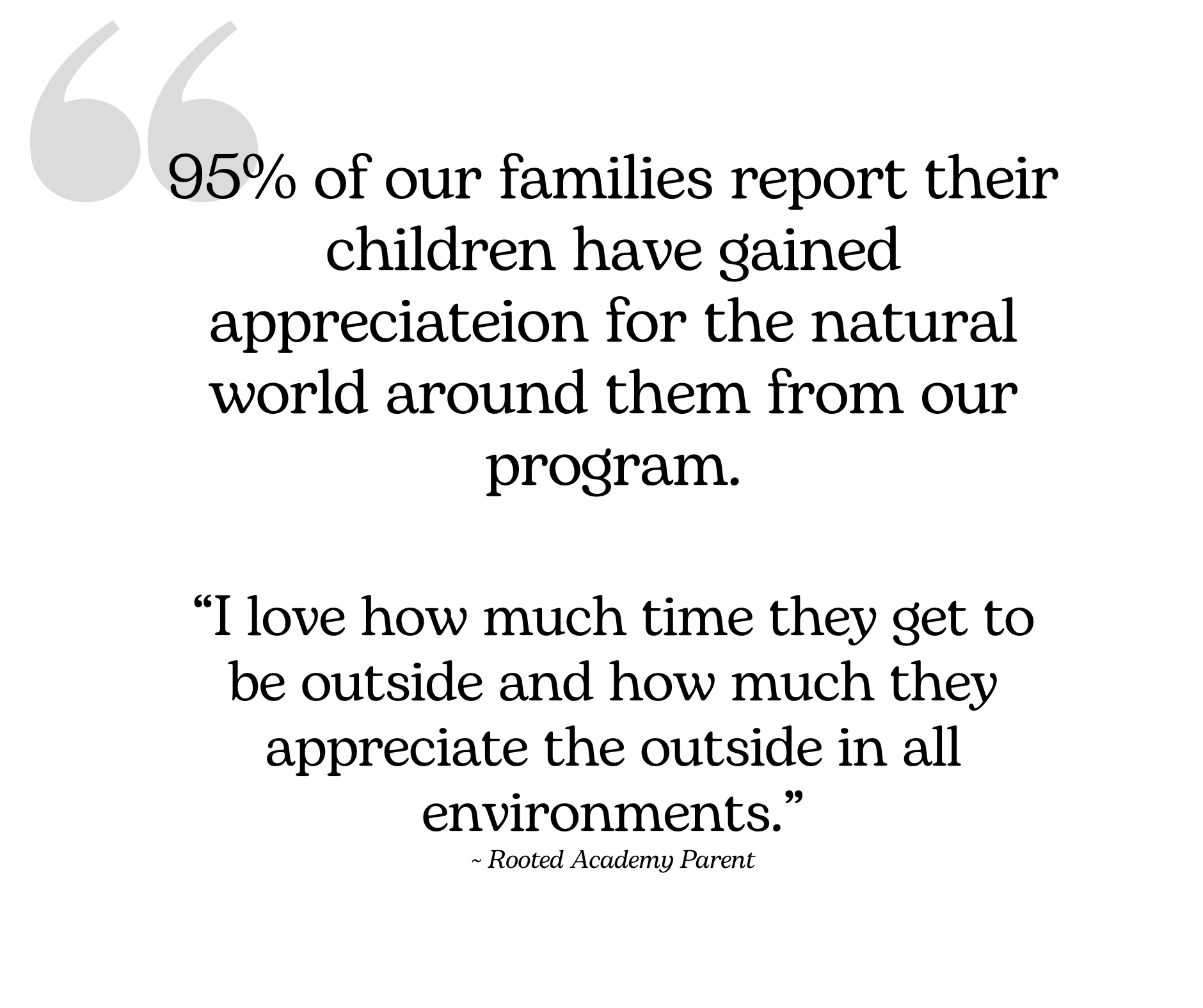 Rooted Academy is suited best for 6.5-11 year olds. (first grade through 5th grade) Our Wild Seedlings program is ideal for 5-6.5 year olds and our Little Wild Roots program is ideal for 3-5 year olds.