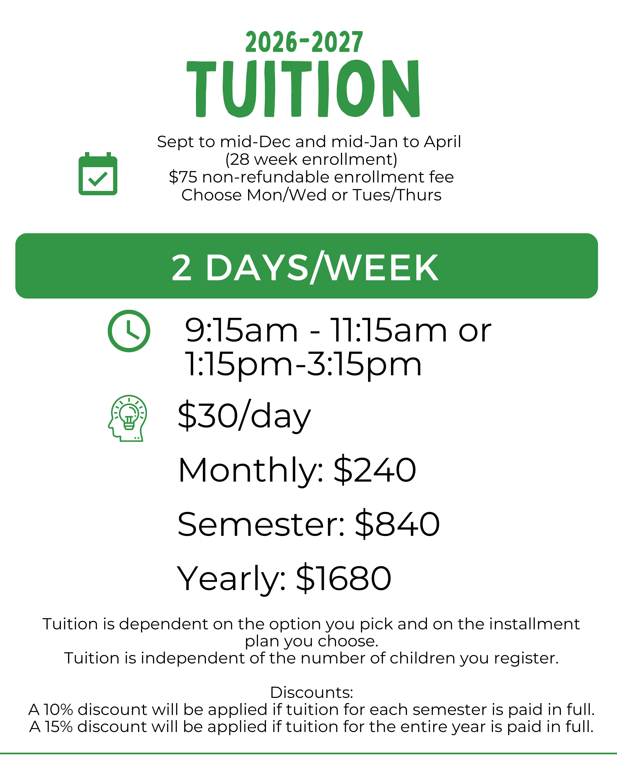 A 15% discount will be applied if tuition for the entire year is paid in full.